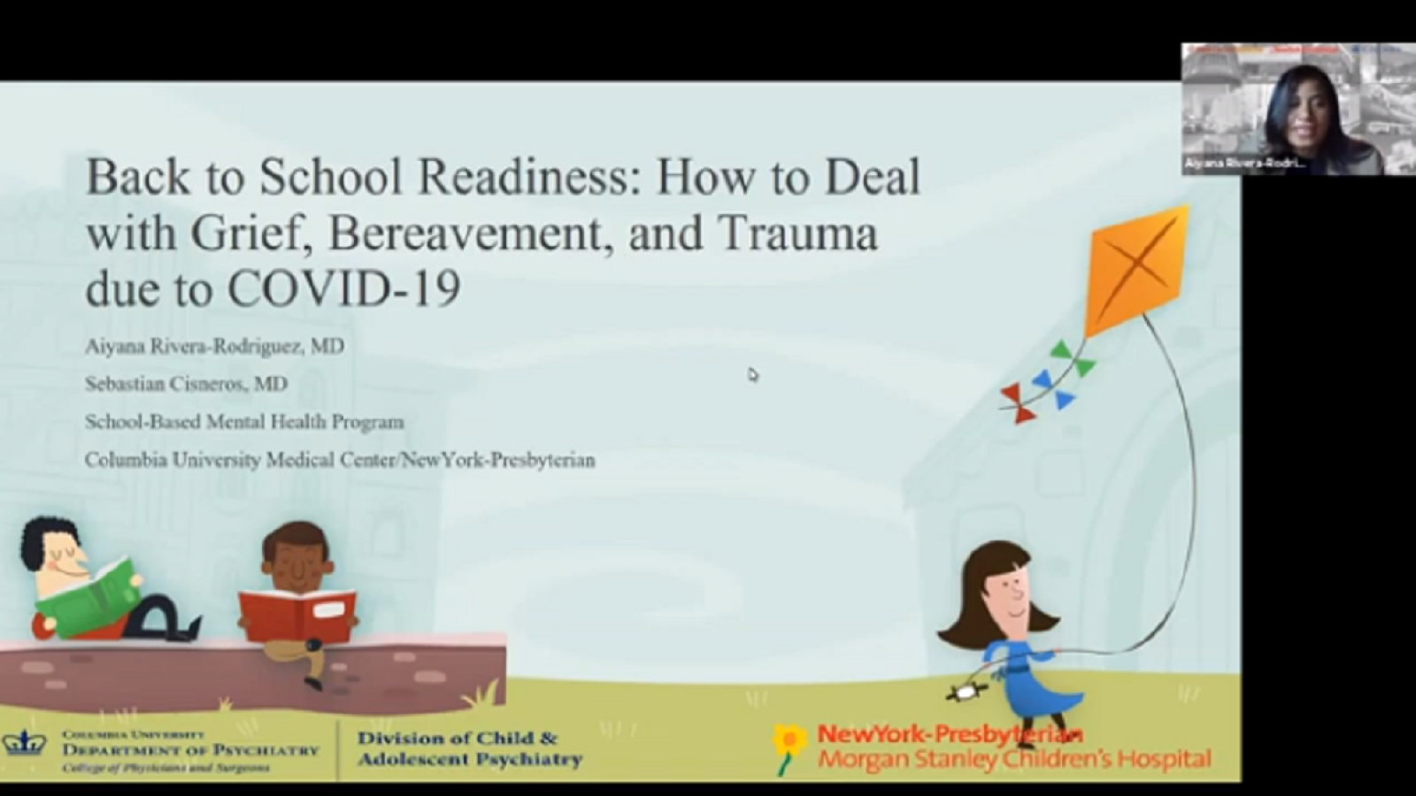 On October 7 and November 9, Aiyana Rivera-Rodriguez, MD and Sebastian Cisneros, MD, both Child and Adolescent Psychiatrists at NewYork-Presbyterian Columbia University Irving Medical Center, spoke to families about mental health. In their presentation, titled “Mental Health and Back to School Readiness during COVID-19”, Dr. Rivera-Rodriguez and Dr. Cisneros spoke about grief, bereavement, and trauma due to COVID-19 and discussed tips and techniques to help families deal with COVID-19 trauma.