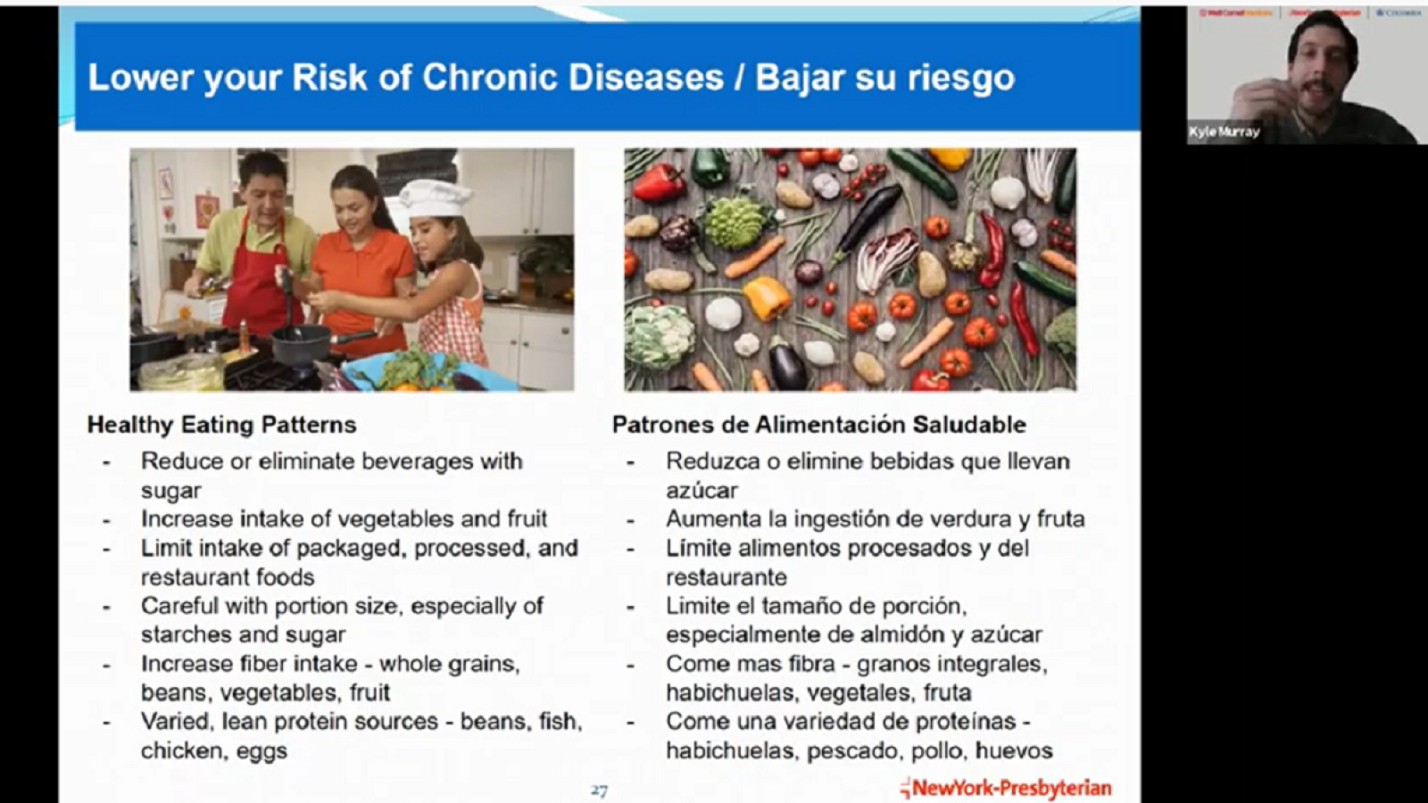 The October 21 and November 16 sessions were dedicated to the topic of Nutrition. The sessions were led by Ileana Vargas, MD, Pediatric Endocrinologist, NewYork-Presbyterian Columbia University Irving Medical Center, and Kyle Murray, MS, RD, CDN, CDE, Community Nutrition Specialist, NewYork-Presbyterian Columbia University Irving Medical Center. Mr. Murray and Dr. Vargas spoke to families, students, and staff about nutrition and presented a didactic overview about the importance of reading nutrition labels and incorporating healthy eating into everyday lives. Dr. Vargas and Mr. Murray also spoke about the challenges and impact that COVID-19 has brought to our eating patterns.